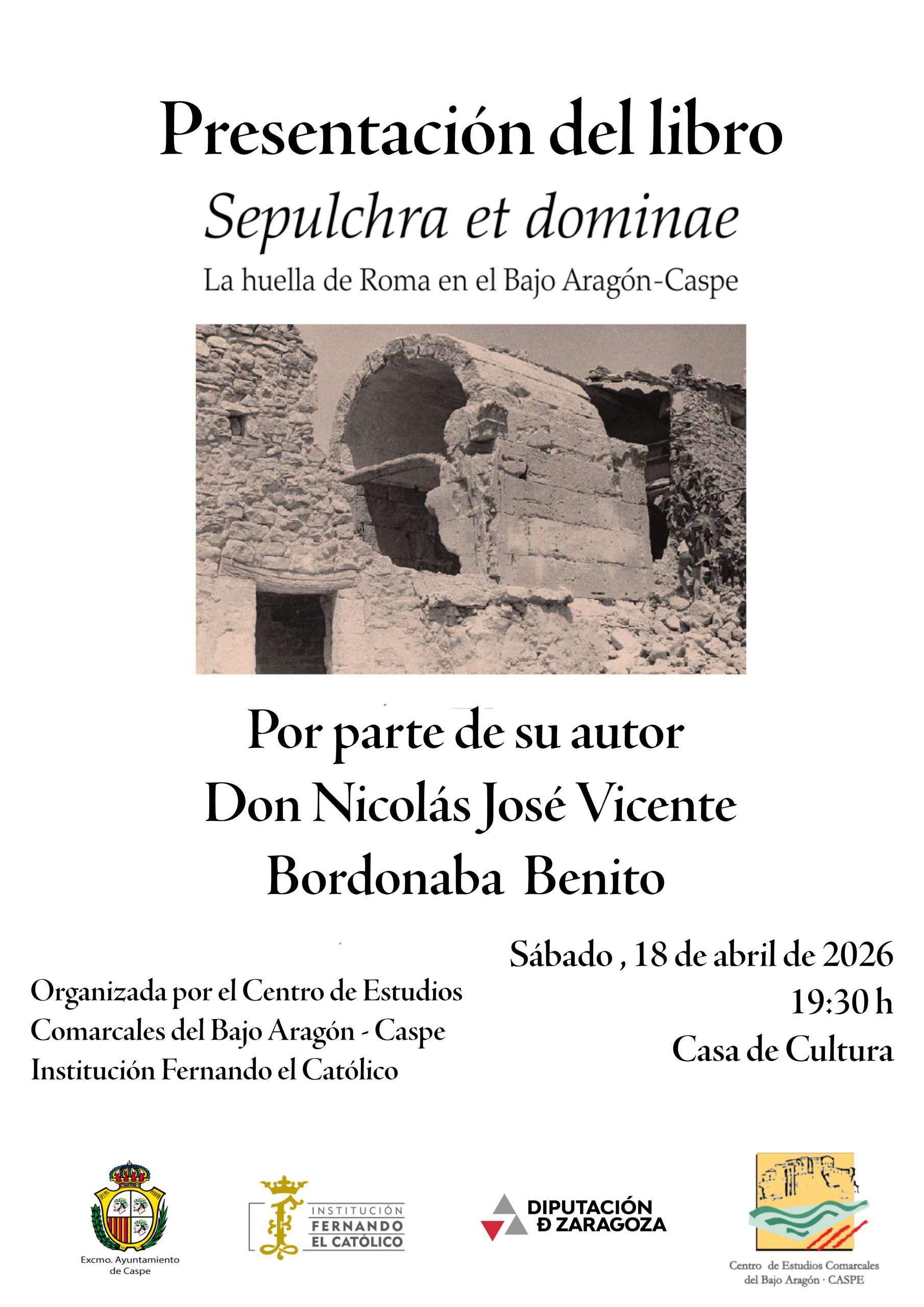 presentación del libro » Sepulchra et dominae. La huella del Roma en el Bajo Aragón Caspe» por parte del autor Nicolas José Vicente Bordonaba Benito En la Casa de Cultura de Caspe, el sábado día 18 de abril a las 19:30 h